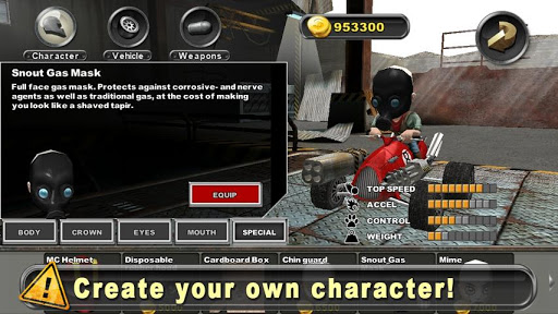 Mix and match pieces to create your own custom character and kart, then equip it with all the machine guns, missiles, mines and exotic implements of doom it can carry. Unlock new parts to tweak your character and kart even further.